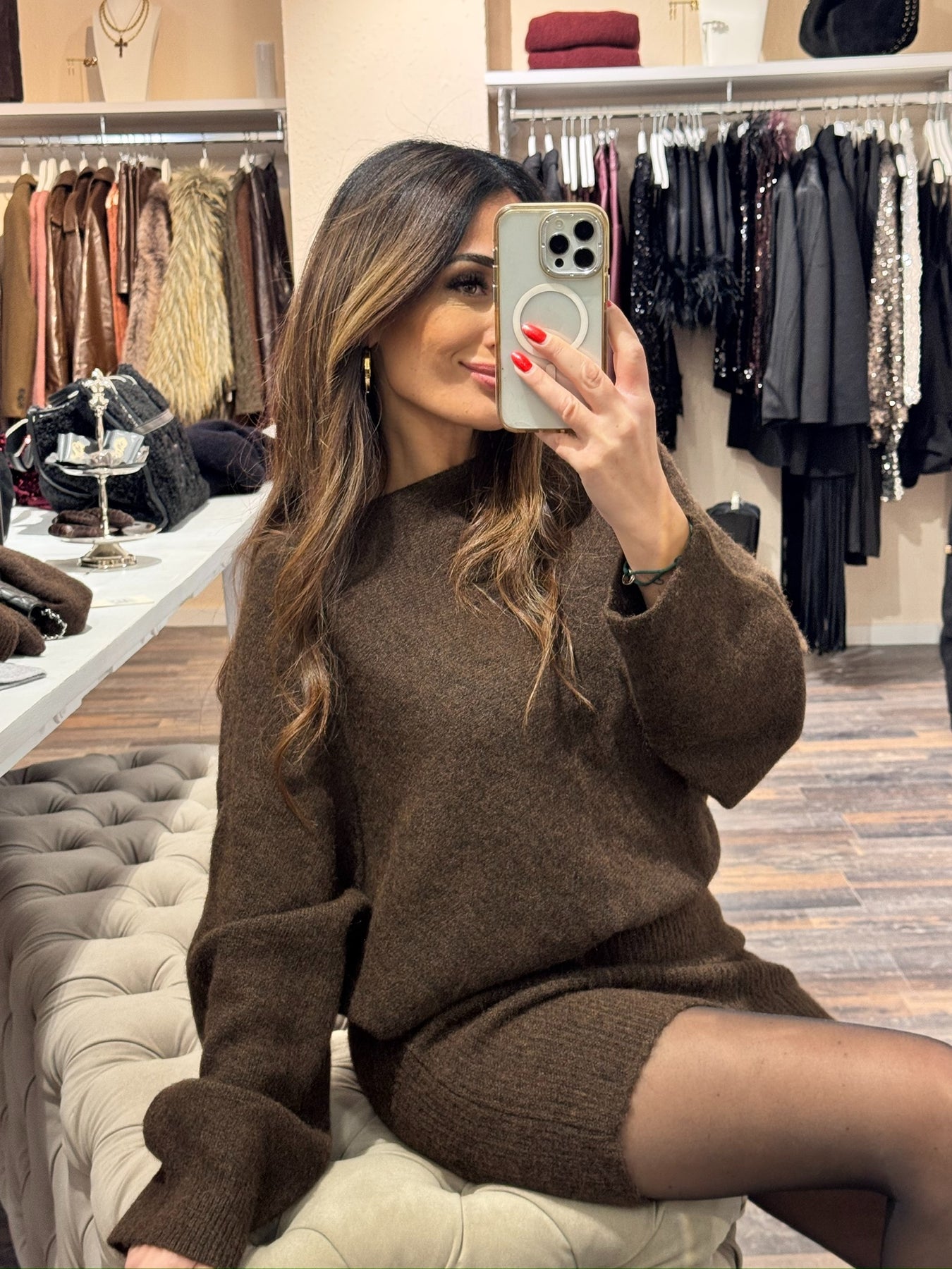 Ein Strickkleid in tiefem Schokobraun mit weich fließendem Oberteil und figurbetontem Rockpart. Die zarte Maschenstruktur sorgt für ein angenehmes Tragegefühl und eine elegante Silhouette. Ein Kleid, das Wärme und feminine Präsenz perfekt vereint.