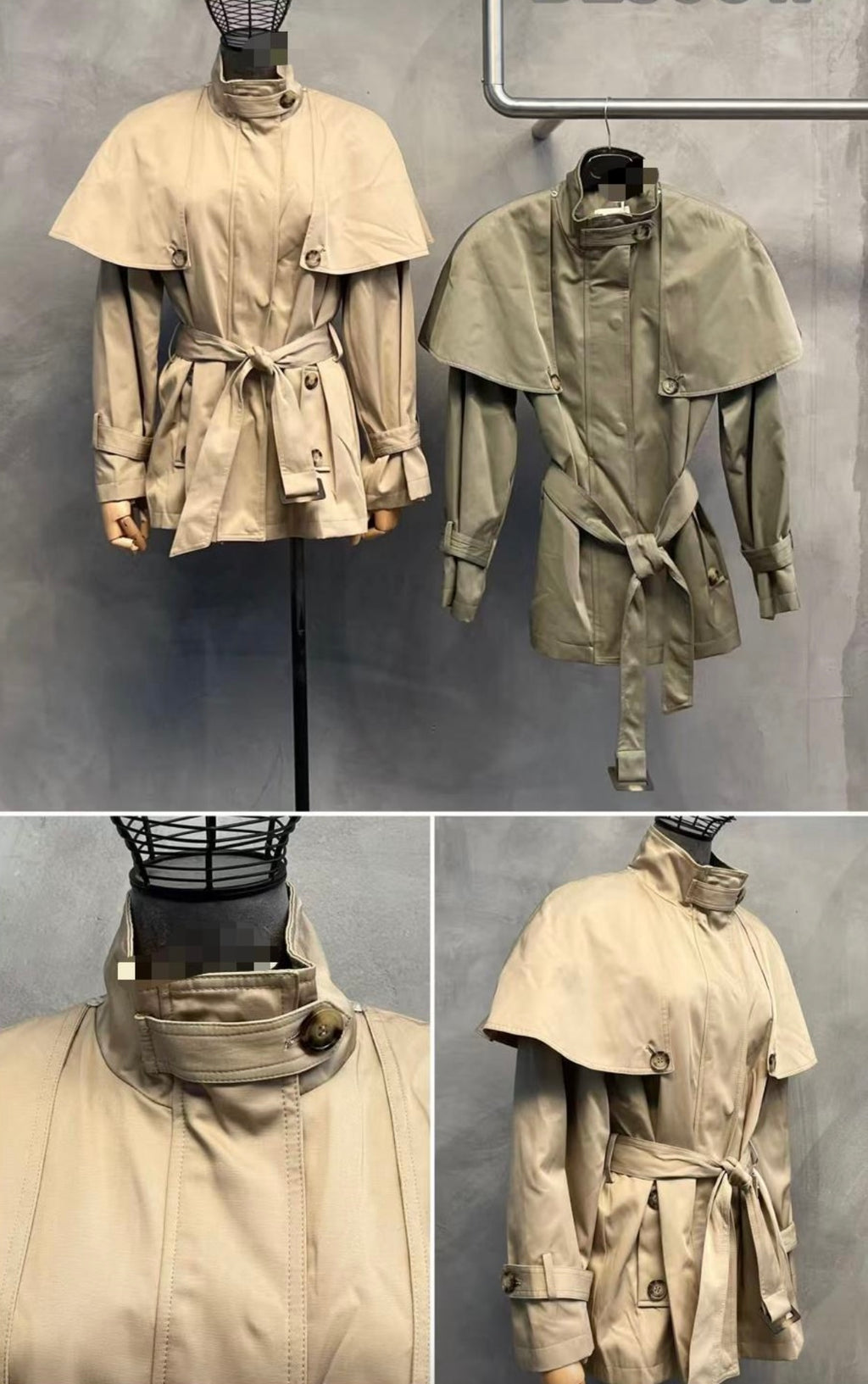 Der hohe Stehkragen, der Bindegürtel und die klare Silhouette verleihen ihr moderne Eleganz und zeitlosen Chic.