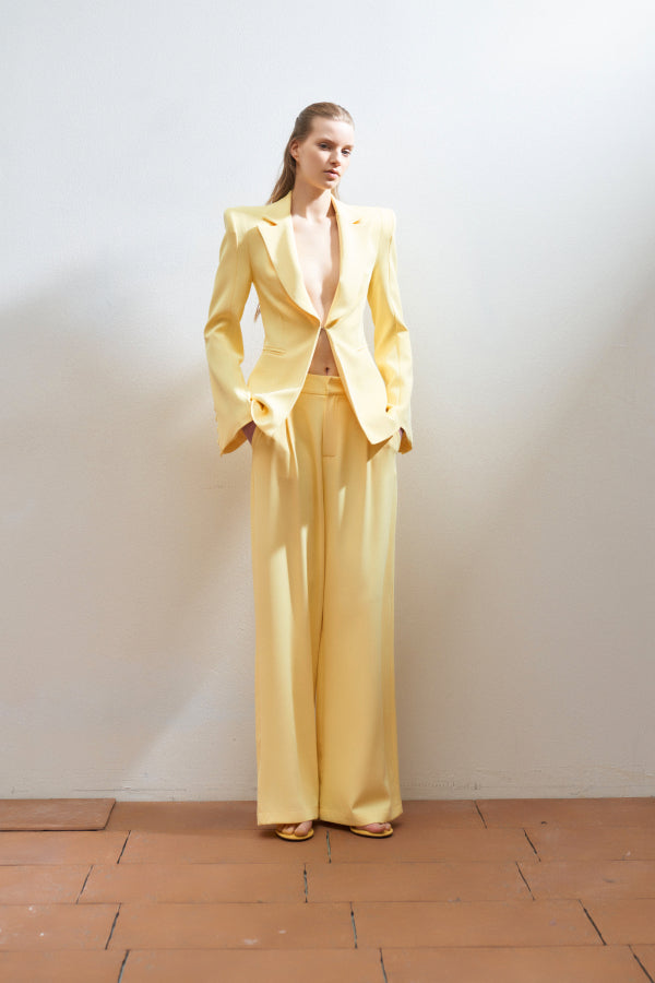Pastellgelb verleiht der SOFIA JACKET ihre kompromisslose Präsenz. Präzise Tailoring-Linien, ein elegant geformter Reverskragen und die definierte Schulterpartie formen eine starke, reduzierte Silhouette. Ein Design mit Haltung – klar, souverän und zeitlos.
