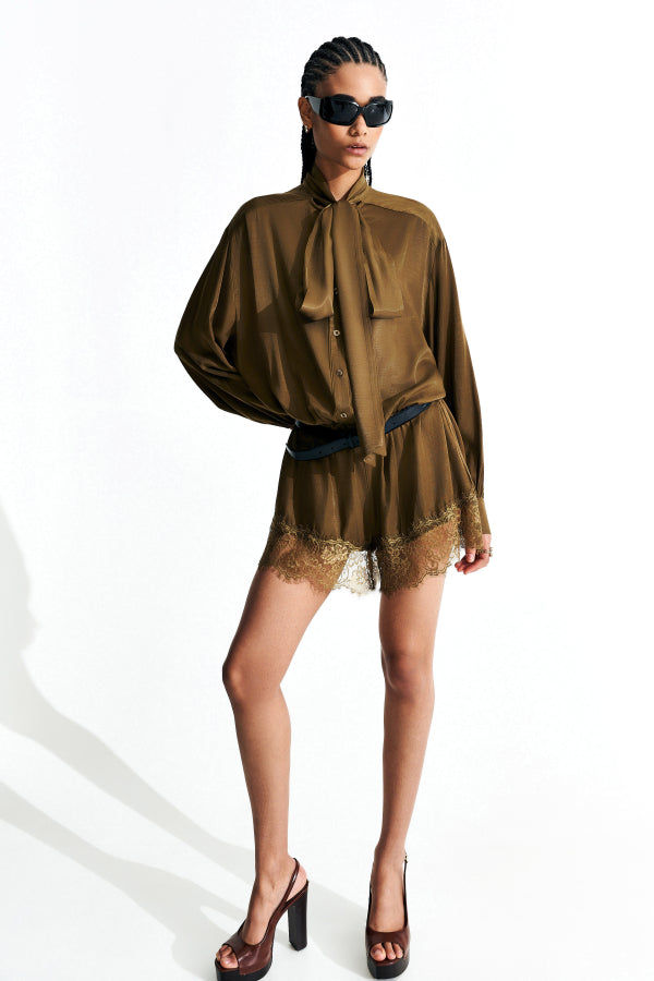 Der DARA JUMPSUIT verbindet fließende Eleganz mit femininer Raffinesse. Die weich fallende Silhouette wird durch eine stilvolle Schleifenpartie im Oberteil akzentuiert, während der Spitzenabschluss an der Shorts-Länge dem Look Tiefe und Sinnlichkeit verleiht. Ton in Ton gehalten, wirkt der Einteiler selbstbewusst, edel und besonders – ideal für besondere Anlässe und stilvolle Auftritte.