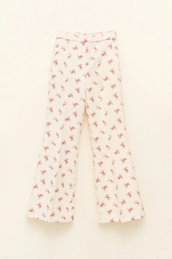 Die hoch geschnittene Hose überzeugt durch ihren fließenden Fall und das weit ausgestellte Bein. Der zarte Blütenprint auf cremiger Basis sorgt für eine leichte, elegante Wirkung und streckt optisch die Silhouette.
