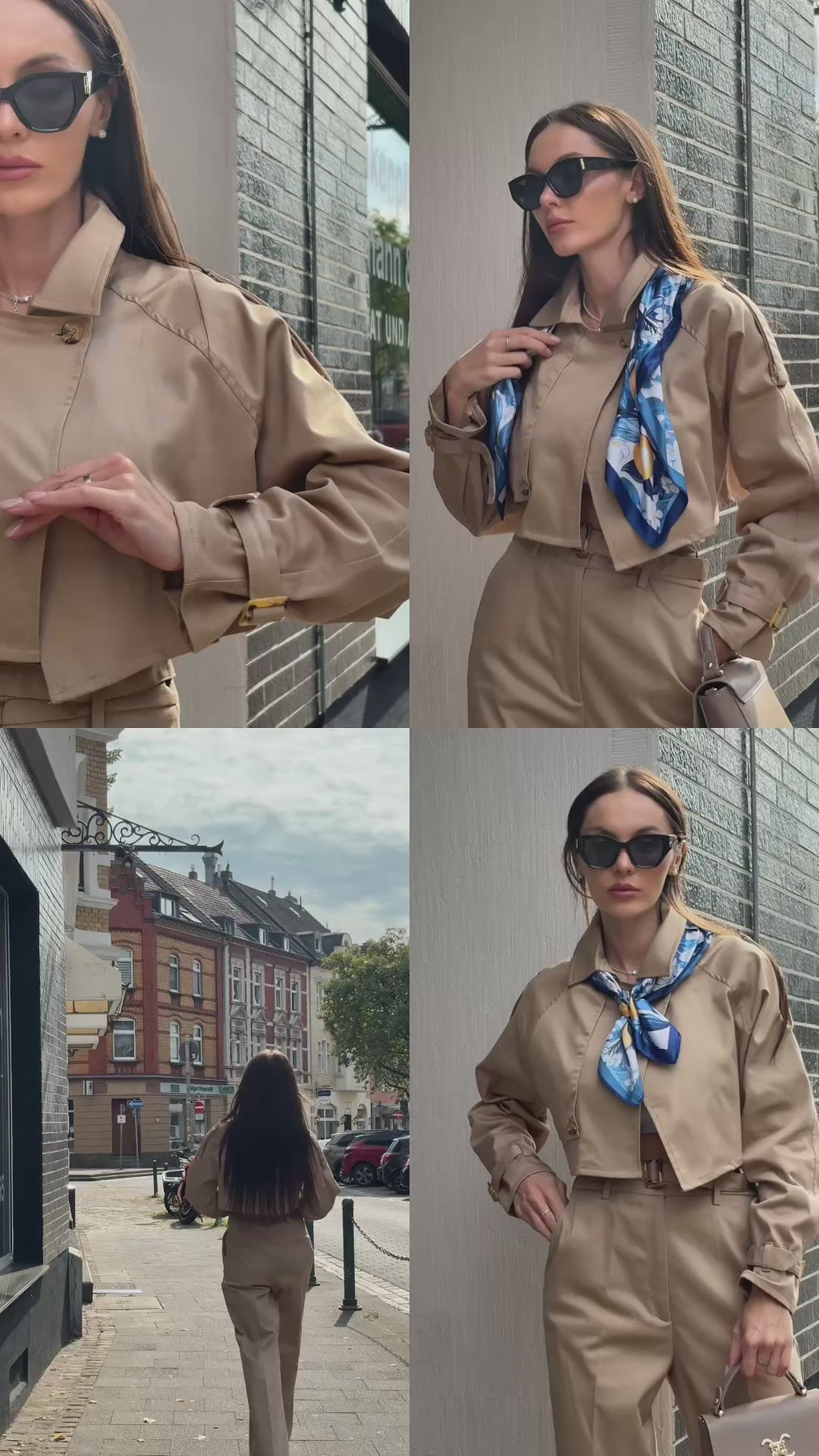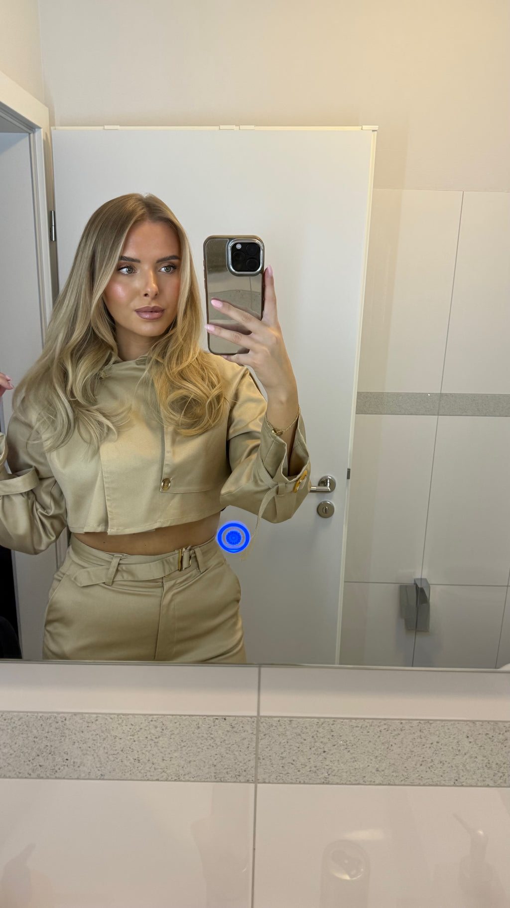 Das Ensemble aus cropped Oberteil und High-Waist Hose besticht durch seine klare Linienführung und edlen Sandton.