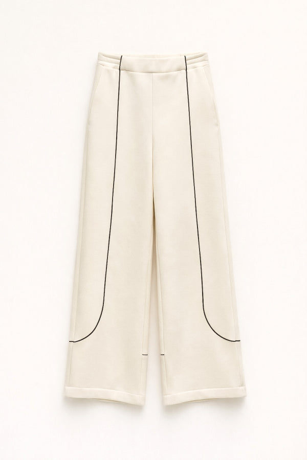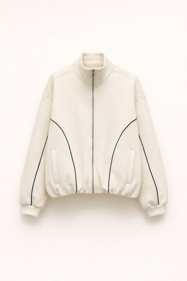 Die Jacke setzt mit ihrem Reißverschluss und den präzisen Linien ein reduziertes Statement, während die Hose mit fließender Weite für Balance und Ruhe sorgt.
