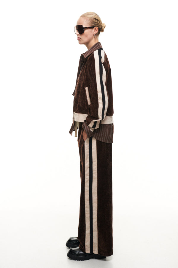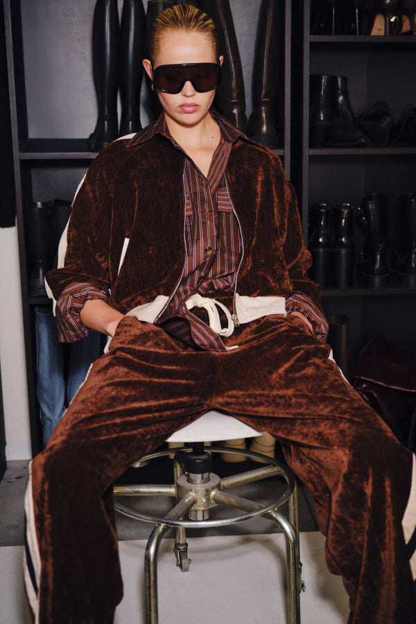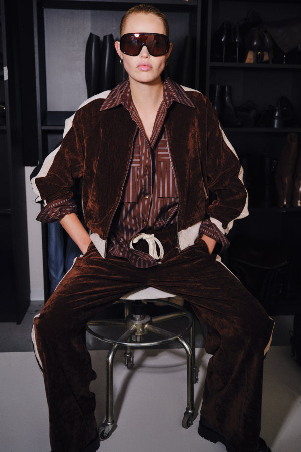 Sportlich trifft sophisticated: Unser Velvet Track Set in tiefem Espressobraun vereint entspannten Schnitt mit luxuriösem Velours-Finish.