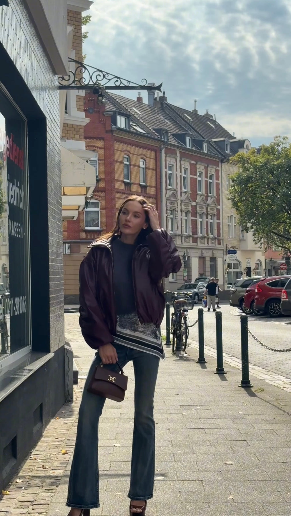 Styling-Tipp: Trage die Amara Flare Jeans mit dem Fiora Mohair Top und der Nubia Bomberjacke für einen exklusiven Alltags-Look. Mit dem Alba Silk Scarf und der Leather Bag mit Signature-Emblem entsteht eine luxuriöse Kombination mit internationalem Flair.