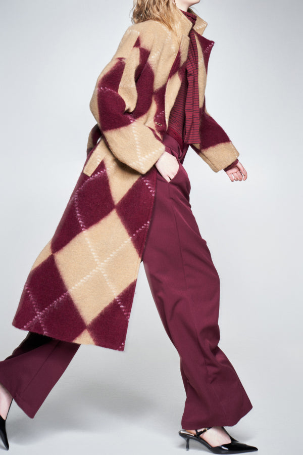Elegante Hose in sattem Burgundton mit fließender, leicht ausgestellter Silhouette. Der Bund ist innen mit feiner Spitze gearbeitet – ein dezenter, femininer Akzent, der die hochwertige Verarbeitung unterstreicht. Bundfalten und seitliche Eingrifftaschen runden das klare Gesamtbild ab. Ein stilvolles Essential für vielseitige Looks.