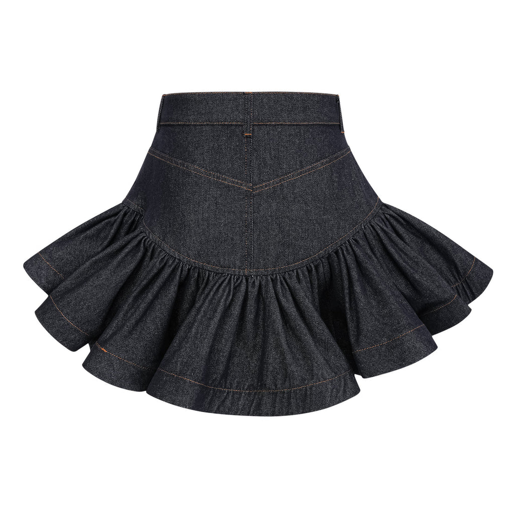 Der Denim Flounce Mini Skirt vereint die lässige Coolness von Jeansstoff mit einem femininen, ausgestellten Volant-Saum. Der taillierte Schnitt betont die Silhouette, während goldene Herz-Details an den Knöpfen für einen charmanten Akzent sorgen. Praktische Taschen und feine Kontrastnähte unterstreichen das hochwertige Design.