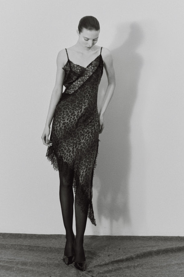 Das LEA DRESS vereint verführerische Eleganz mit einem Hauch von Wildheit. Das Satinmaterial in Leopardenoptik wird durch feine schwarze Spitzenbesätze an Dekolleté und Saum betont. Der asymmetrische Schnitt verleiht dem Kleid eine moderne, fließende Silhouette – ideal für stilvolle Abende mit Statement-Charakter.